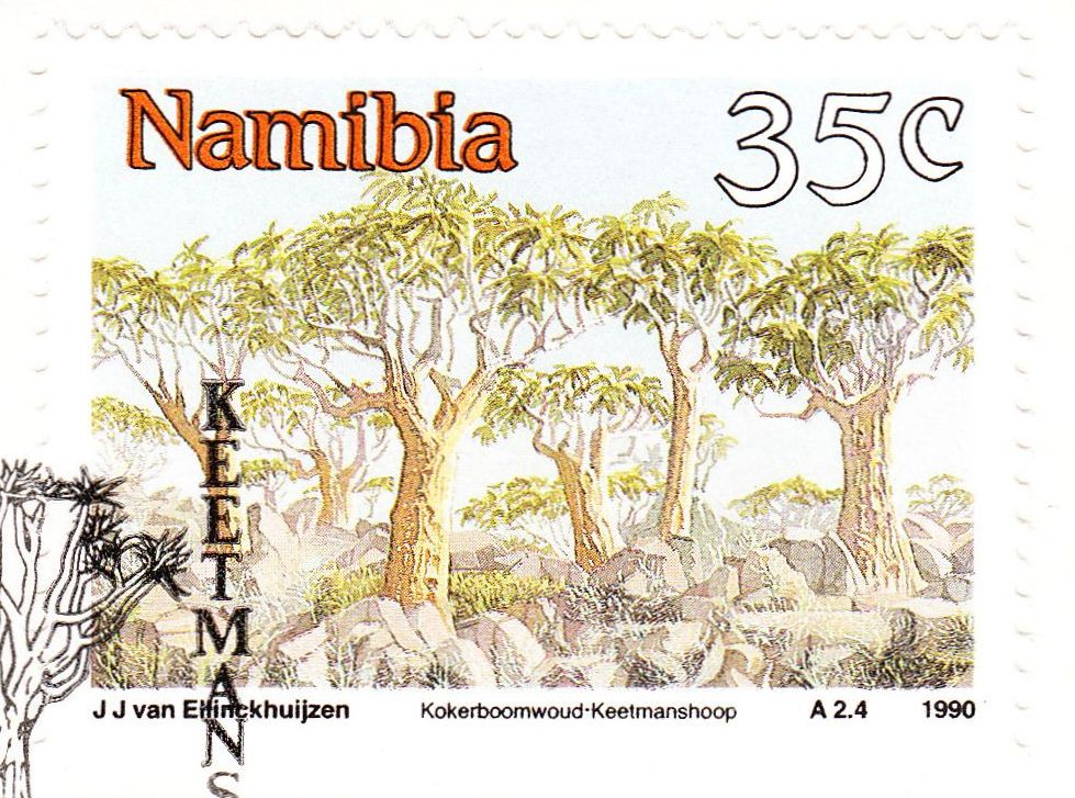Eine besonders große Anzahl Köcherbäume wächst im Köcherbaumwald nordöstlich von Keetmanshoop, was man mit dieser Marke aus Namibia dokumentieren kann: