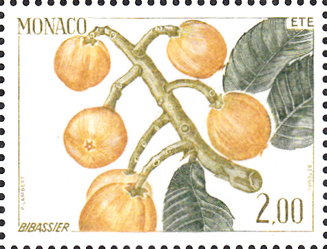 Hier die Marke aus Monaco (MiNr 1690), die einen Zweig einer Wollmispel (Eriobotrya japonica) im Sommer zeigt.