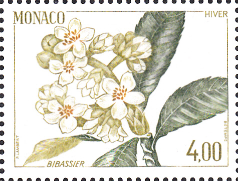 Und diese Marke aus Monaco (MiNr 1692) zeigt einen Zweig der Wollmispel (Eriobotrya japonica) im Winter.