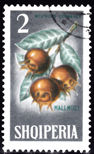 Auf dieser Marke aus Albanien (MiNr 913) werden Früchte einer Mispel gezeigt.
