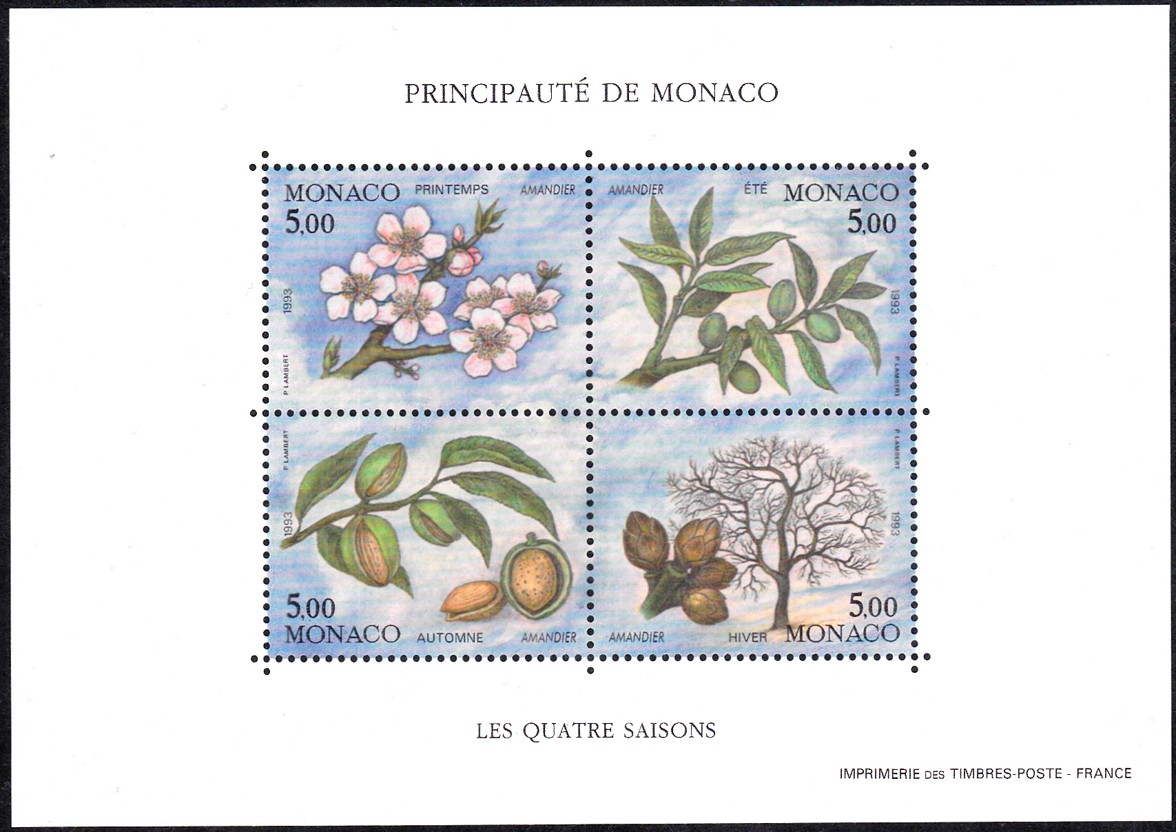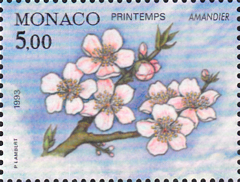 Diese Marke aus Monaco (MiNr 2100) zeigt den Zweig eines Mandelbaumes (Prunus amygdalus) im Frühling.