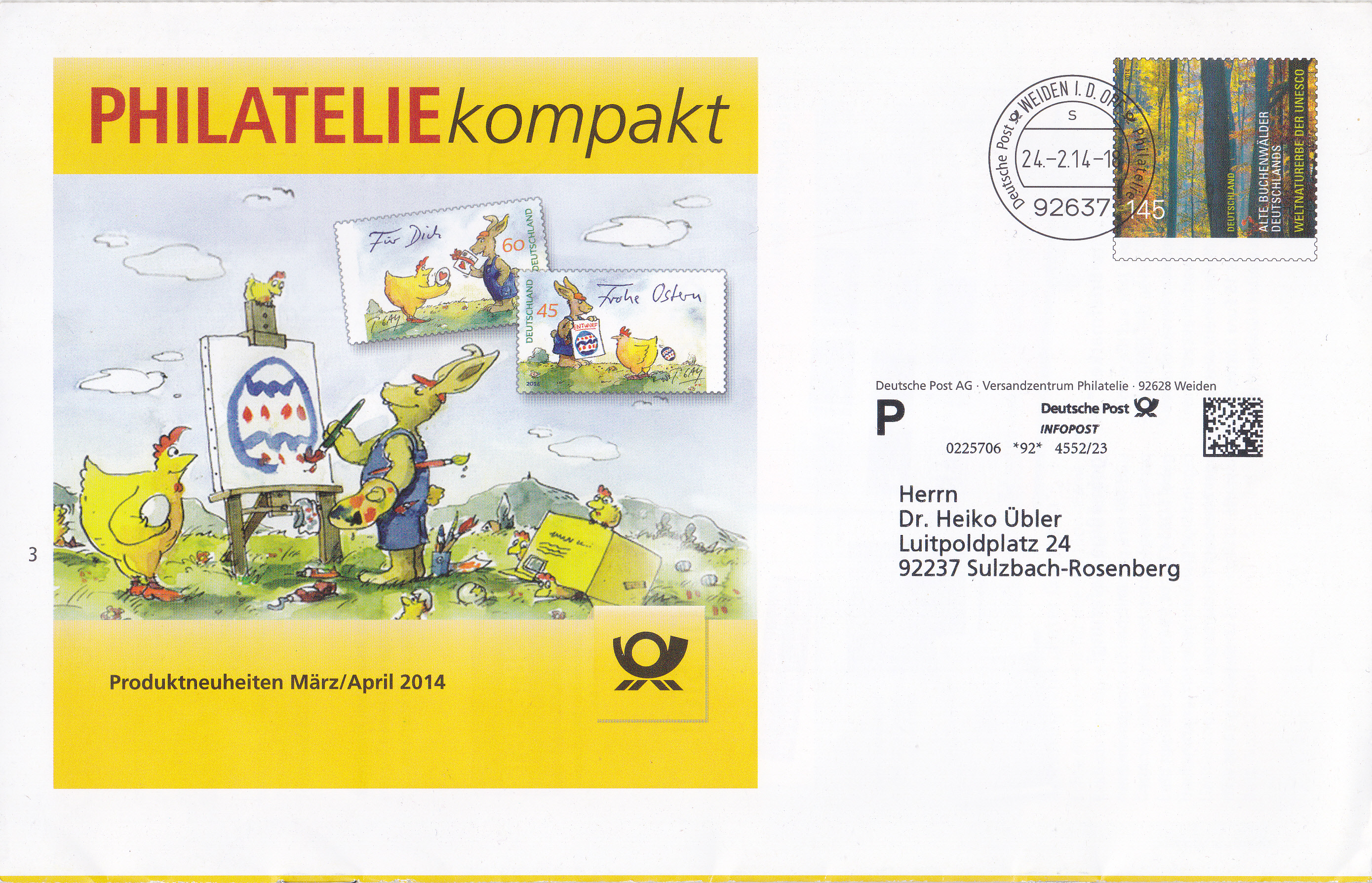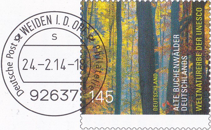 Diese Broschüre im Format 235x150 mm hat einen Wertstempel mit der 145 Cent-Marke "UNESCO-Welterbe: Alte Buchenwälder Deutschlands" (MiNr 3052). Die Vorausentwertung trägt das Datum "24.-2.14".