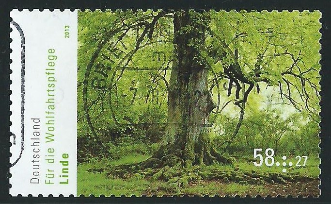 Im Wohlfahrtssatz von 2013 ist eine Zuschlagsmarke zu 58 + 27 ct mit dem Motiv Linde erschienen. Hier einmal in der selbstklebenden Ausgabeform gezeigt: