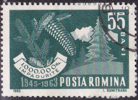 Zum Thema "Aufforstung" erschien in Rumänien diese Marke (MiNr 2212) mit einem Tannenzweig mit Zapfen und Inschrift und einer weiteren Tanne.