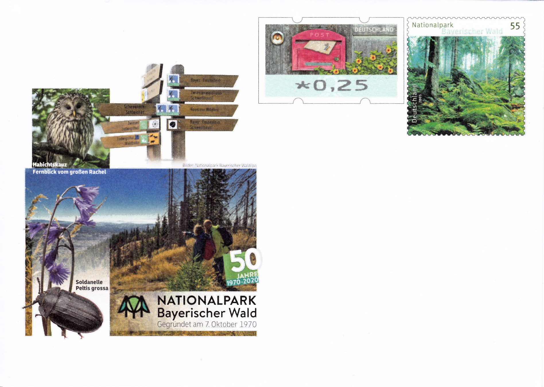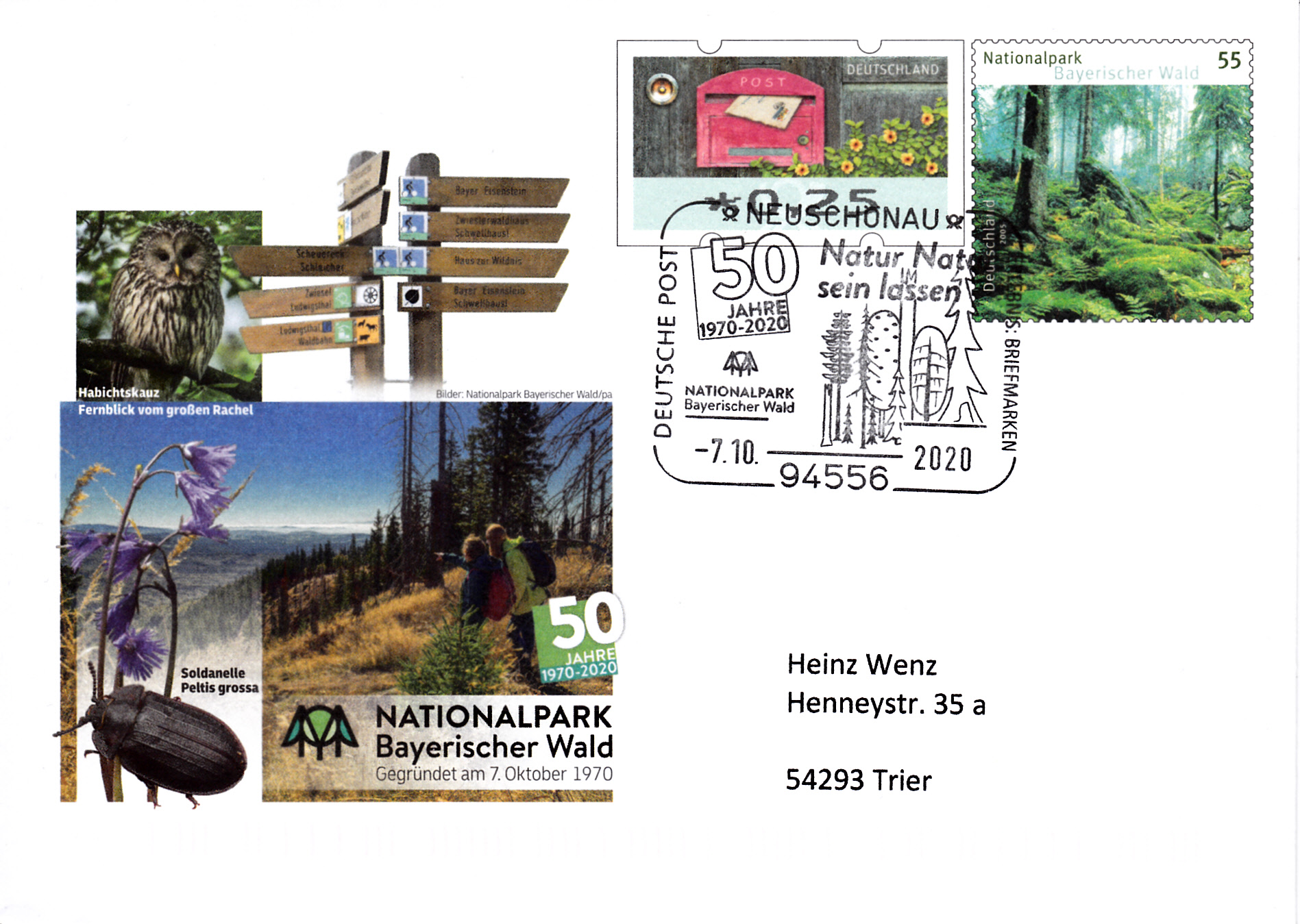 Am 7.10.2020 wurde in Neuschönau ein Sonderstempel zu "70 Jahre Nationalpark Bayerischer Wald" eingesetzt, der auf diesem Umschlag zu sehen ist.