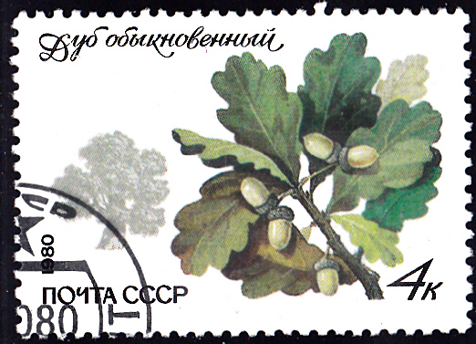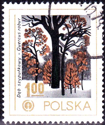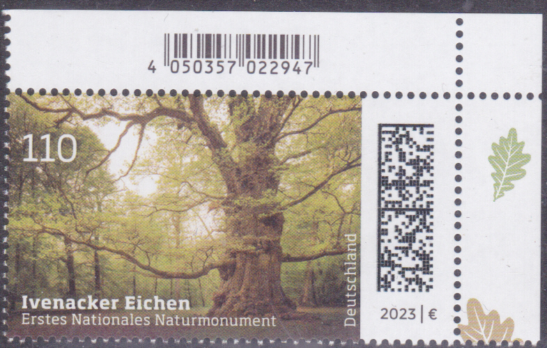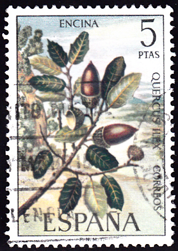 Aus Spanien kommt diese Marke (MiNr 1983) mit einem Zweig einer Steineiche (Quercus ilex).