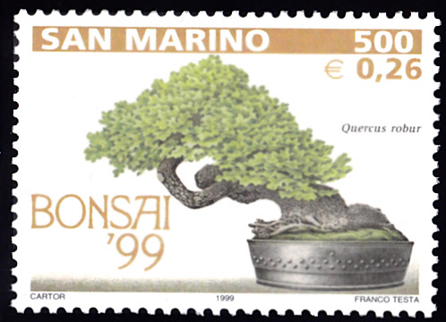 Auf dieser Marke aus Frankreich (MiNr 2516) werden eine Stieleiche, ein Zweig mit Blüten und ein Zweig mit Eicheln gezeigt.