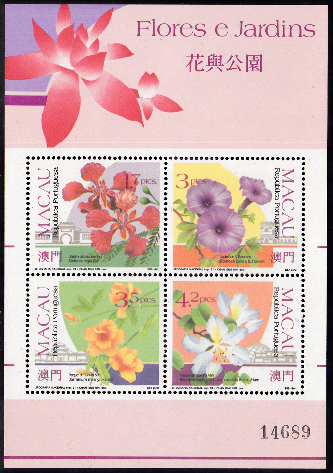 Die Marke aus Macau (MiNr 683) bildet einen blühenden Zweig einer Bauhinia variegata var. candida ("weißer Orchideenbaum) ab. Es ist ein bis zu 12 m hoher, Laub abwerfender Baum mit weißen, orchideenartigen Blüten.