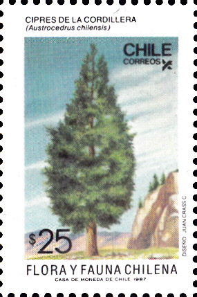Hier eine Marke aus Chile (MiNr 1196) mit der Abbildung einer Chilezeder (Austrocedrus chilensis).