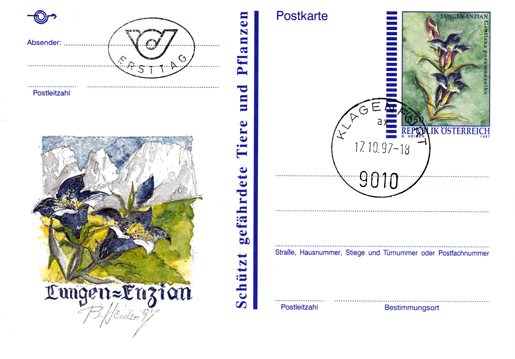 Im Wertstempel einer Ganzsache aus Österreich und im Zudruck ist ein Lungen-Enzian (Gentiana pneumonanthe) abgebildet.