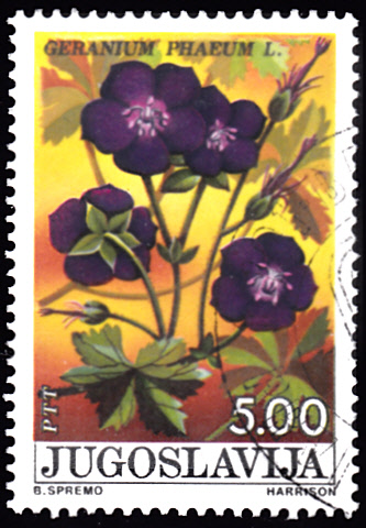 In Jugoslawien ist eine Marke (MiNr 1604) mit einem Braunen Storchschnabel (Geranium phaeum) erschienen. Michel nennt ihn falsch als Purpur-Storchschnabel (Geranium phaeum), das wäre aber der Purpur-Storchschnabel (Geranium purpureum).