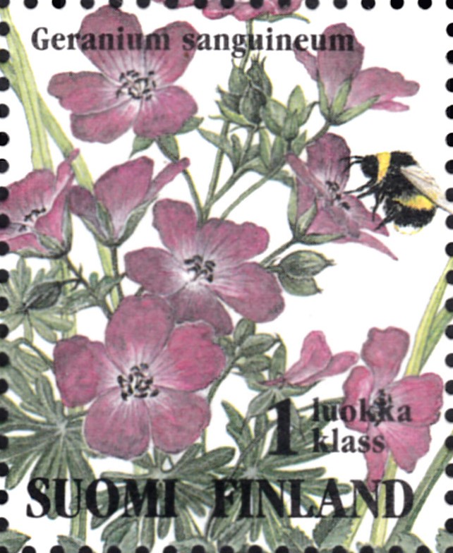 Hier zeige ich eine Marke aus Finnland (MiNr 1260), die einen Blutroten Storchschnabel (Geranium sanguineum) abbildet.
