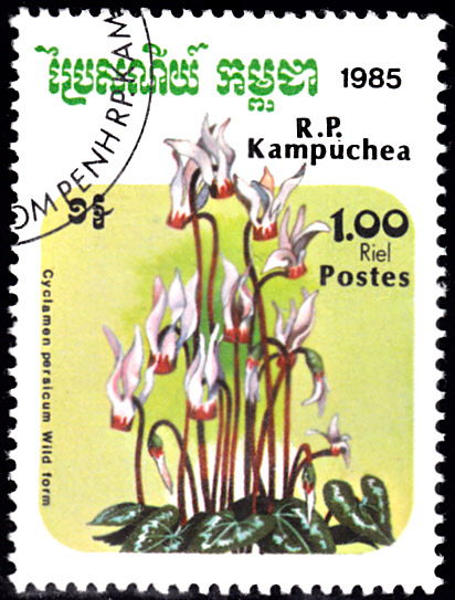 Auch auf einer Marke aus Kambodscha (MiNr 676) sind Blüten von einem Alpenveilchen (Cyclamen persicum) zu sehen.