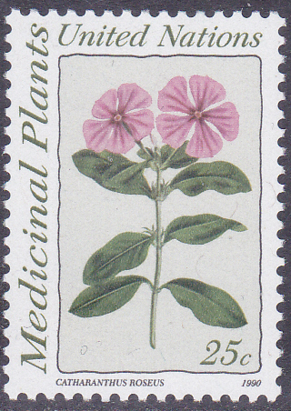 Bei der Post der Vereinten Nationen New York ist in einer Ausgabe "Heilpflanzen" ebenfalls eine Marke (MiNr 600) mit einer Abbildung einer Rosafarbenen Catharanthe (Catharanthus roseus) erschienen. Sie zeigt eine Illustrationen aus "The Botanical Magazine" von William Curtis (1746-1799, englischer Botaniker).