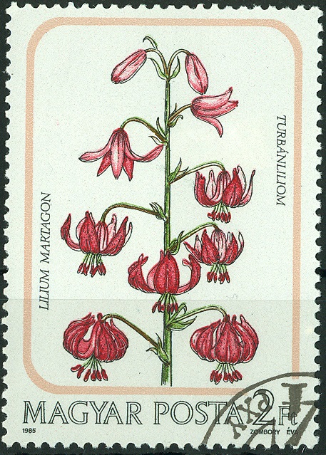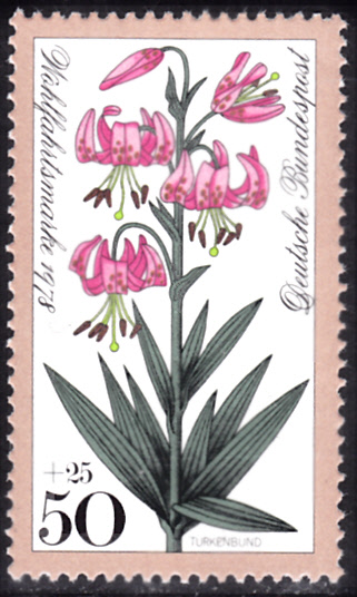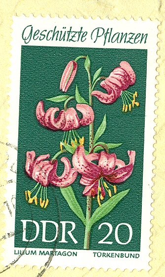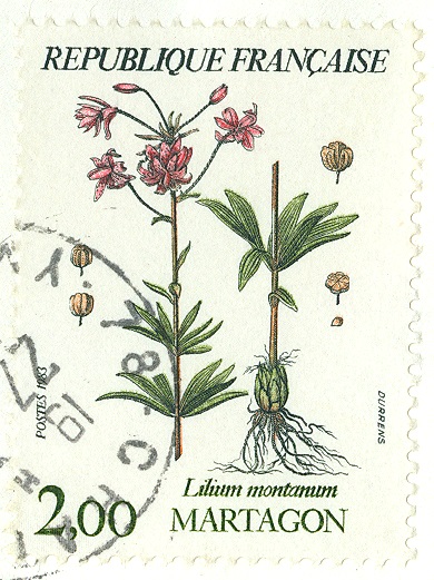 Auf dieser Motiv-Marke der französischen Post kann man eine solche Türkenbund-Lilie sehen. Hier auf einem echt gelaufenen Brief nach Deutschland.