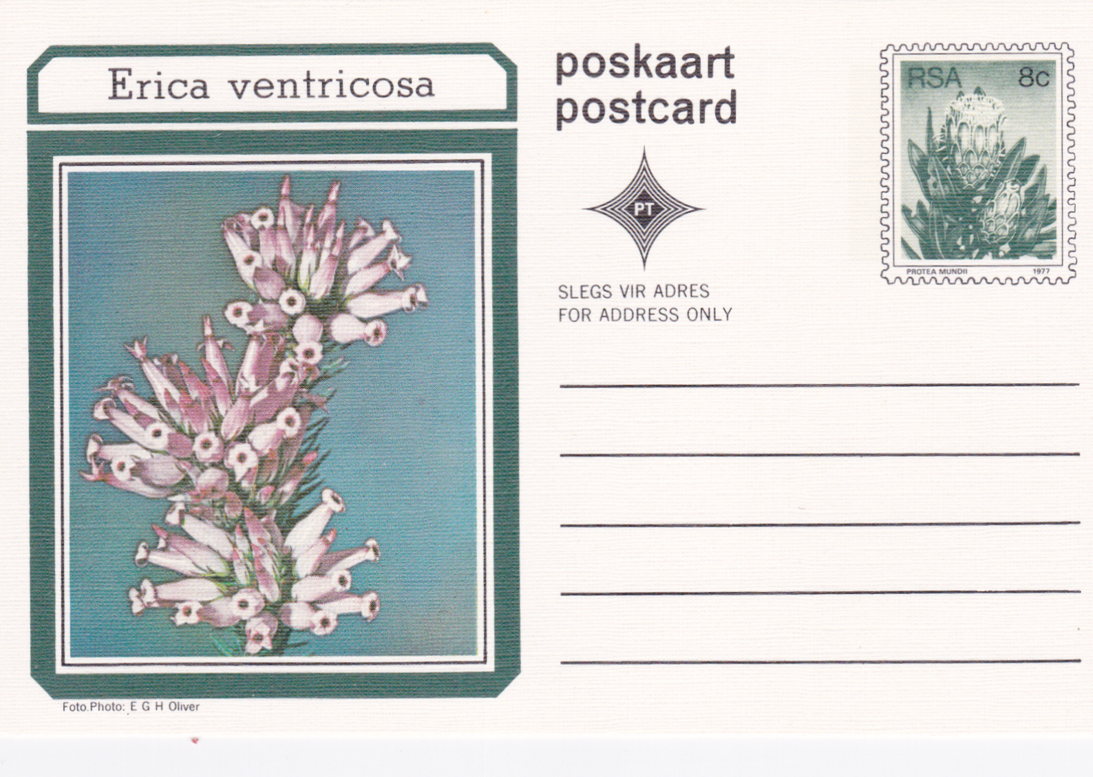 Auf dieser Bildpostkarte sind im Zudruck Blüten der Erica strigilifolia zu sehen.