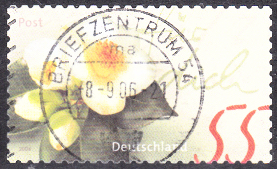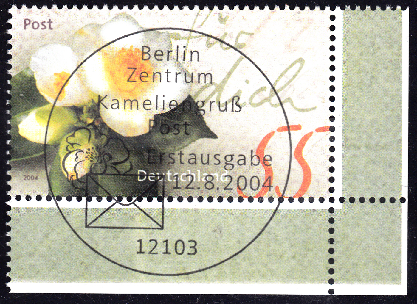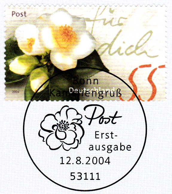 Dieser "Gedenkumschlag" (MiNr USo 78) mit einem Wertstempel im Muster der Marke "Kameliengruß" (MiNr 2414) wurde zum Jubiläum "200 Jahre Kamelien in Sachsen" 2004 herausgegeben.