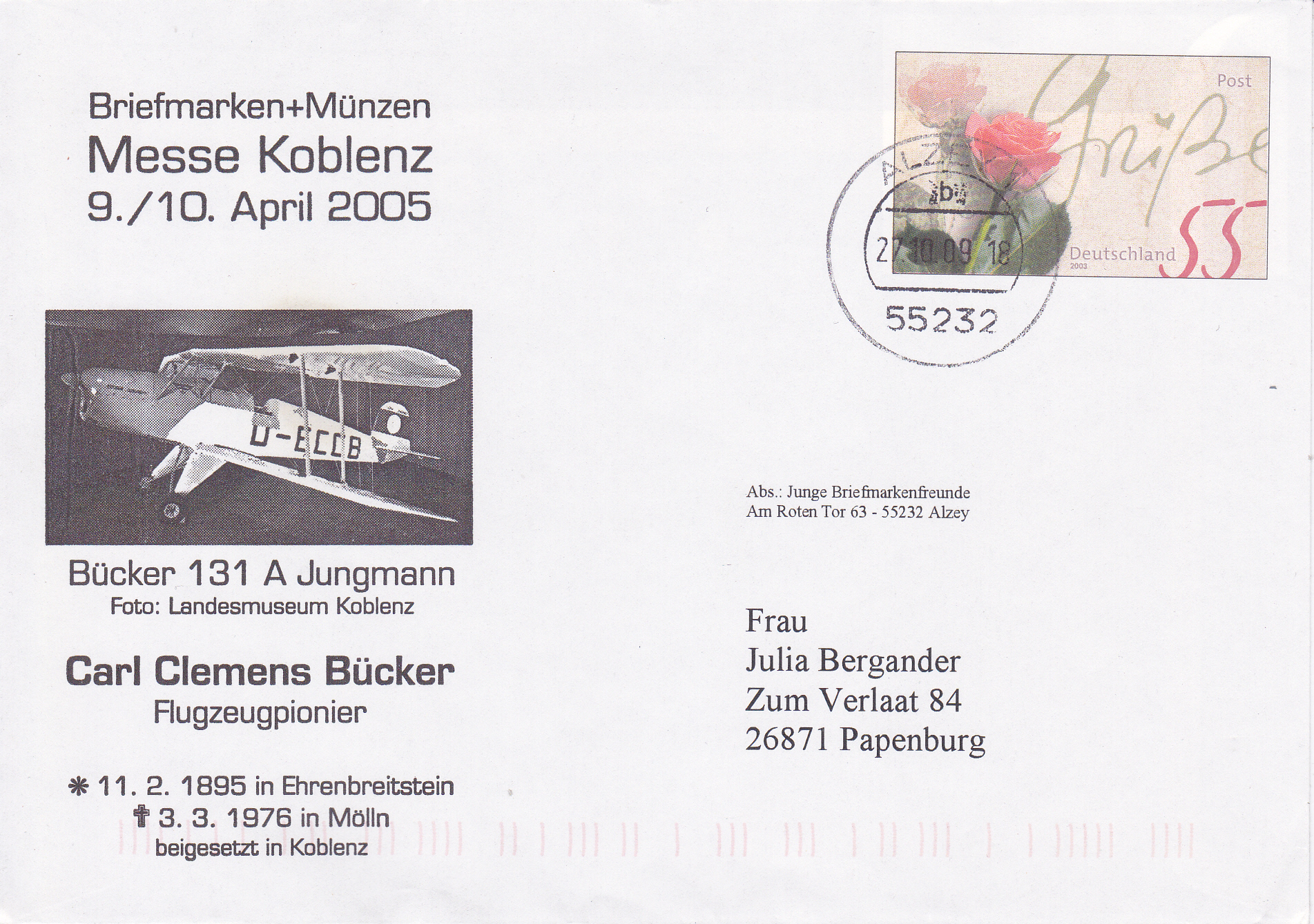 Dieser "Plusbrief" (MiNr USo 71) mit einem Wertstempel im Muster der Marke "Rosengruß" (MiNr 2317) wurde mit einem Zudruck zur Briefmarken + Münzen Messe 2005 in Koblenz versehen.
