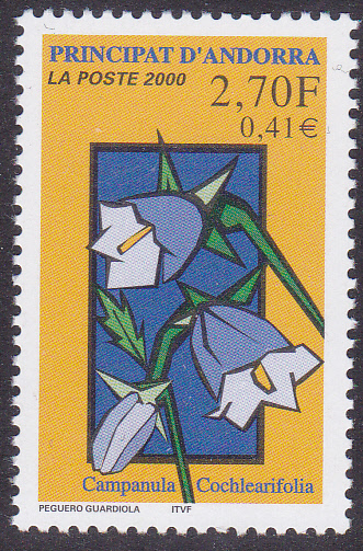 Diese Marke der französischen Post in Andorra (MiNr 550) bildet eine Zwerg-Glockenblume (Campanula cochleariifolia) ab.