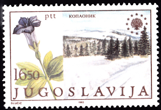 auf der linken Seite dieser Marke aus Jugoslawien (MiNr 2000) ist ein Kochscher Enzian abgebildet.