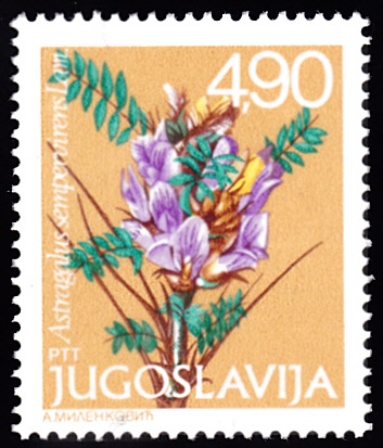 Auf dieser Marke aus Jugoslawien (MiNr 1791) wird ein Dorn-Tragant (Astragalus sempervirens) abgebildet. Bei Michel wird der Name mit Begraunter Tragant (Astragalus sempervirens) angegeben.