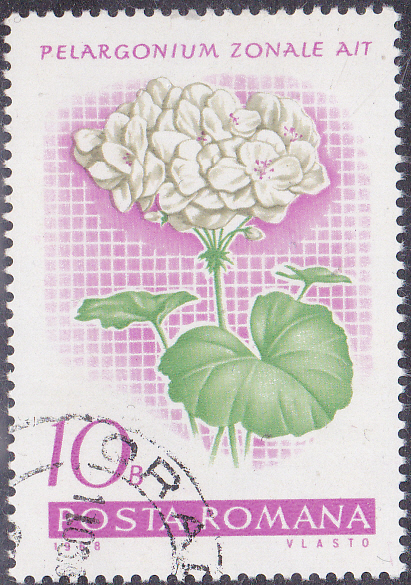 Auch in Rumänien gibt es eine Serie mit Abbildungen von Pelargonien. Hier die Marke zu 10 Bani (MiNr 2686) mit einer Pelargonium zonale hybr..