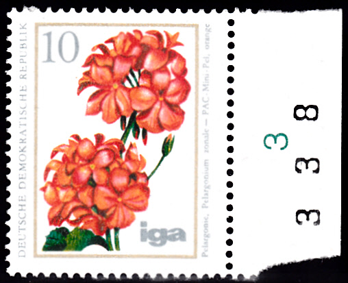Auf dieser Marke der DDR (MiNr 2071) sehen wir eine weitere Zuchtform der Pelargonium zonale. Sein trägt den Namen "PAC-Mini-Pelargonie".