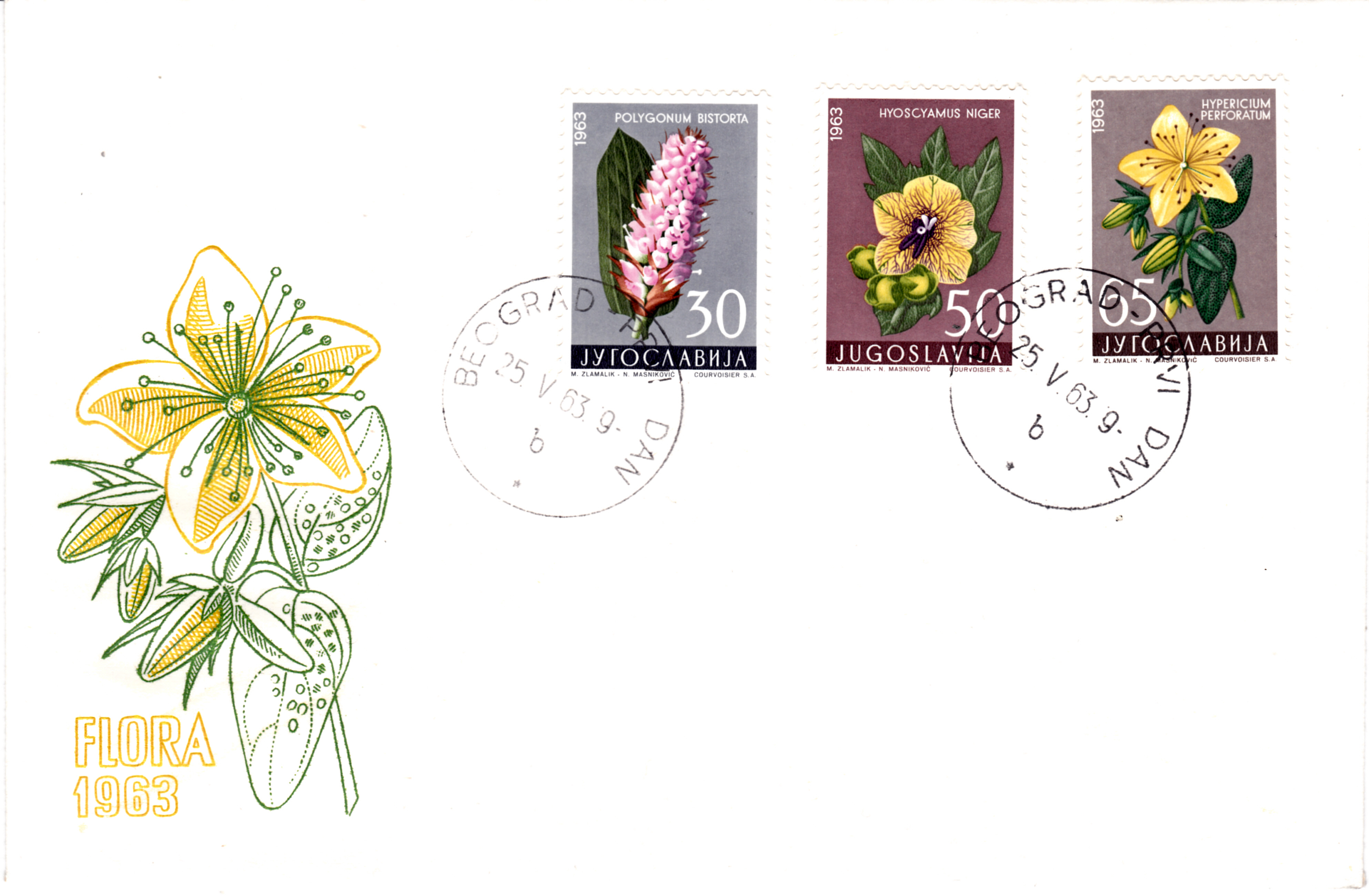 Auf dieser Marke aus Jugoslawien wird eine Blüte des Echten Johanniskraut (Hypericum perforatum) gezeigt.