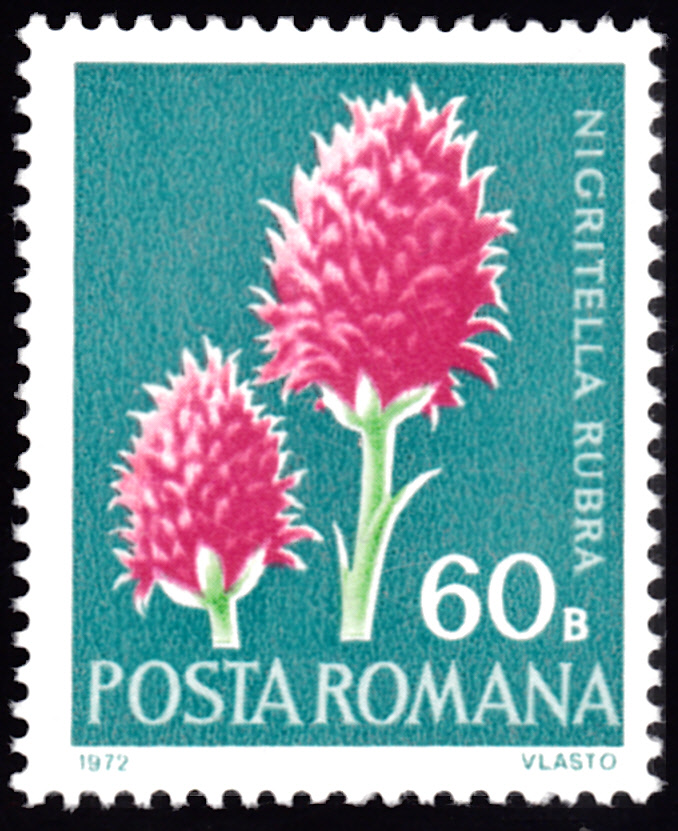 Auf dieser Marke aus Rumänien (MiNr 3026) sind zwei Blüten des Roten Kohlröschen (Gymnadenia miniata) zu sehen.