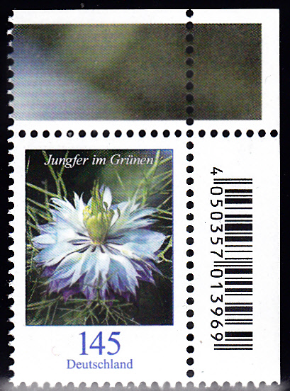 In der Dauerserie "Blumen" der Deutschen Post ist auch eine Marke (MiNr 3351) mit einer Jungfer im Grünen (Nigella damascena) erschienen. Hier zeige ich eine Marke aus dem Bogen mit EAN-Codierung.