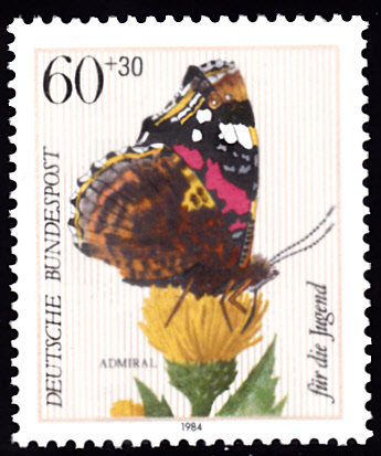 Auf dieser Marke der Deutschen Bundespost (MiNr 1203) sitzt ein Admiral (Vanessa atalanta) auf der Blüte einer Kohl-Kratzdistel (Cirsium oleraceum).