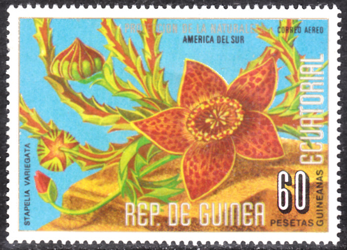 Auf dieser Marke aus Äquatorial-Guinea (MiNr 917) sehen wir eine blühende Orbea variegata (Syn.: Stapelia variegata).