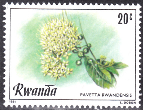 Auf einer Marke (MiNr 1093) des Heimatlandes der Pflanze werden Blüten von Pavetta rwandensis gezeigt.