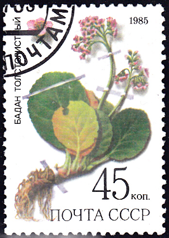 Auf einer Marke der Sowjetunion (MiNr 5532) zeigt eine Dickblatt-Bergenie (Bergenia crassifolia). Bei Michel wird als Name Dickblättrige Bergenie (Bergenia crassifolia) genannt.