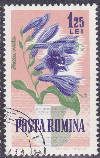 In Rumänien ist diese Marke (MiNr 2274) erschienen. Laut Beschriftung auf der Marke wird eine Hosta ovata gezeigt. Nachlangen Suchen habe ich diesen Namen als Synonym für die Glocken-Funkie (Hosta ventricosa) gefunden.