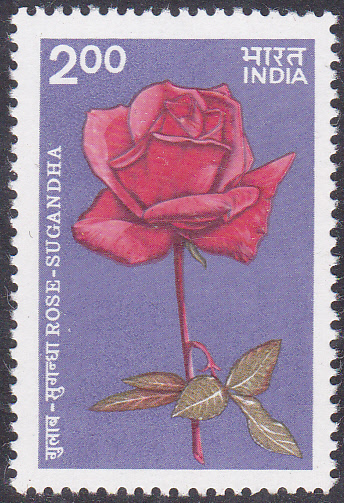 Eine zweite Marke aus Indien (MiNr 1009) bildet die Rose mit dem Namen "Sugandha" ab.