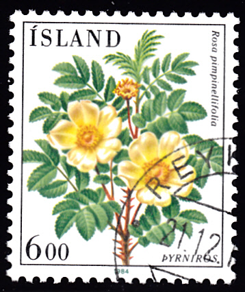Aus Island kommt diese Marke (MiNr 612) mit der schon hier beschriebenen Bibernell-Rose (Rosa spinosissima L.; Syn.: Rosa pimpinellifolia L.).