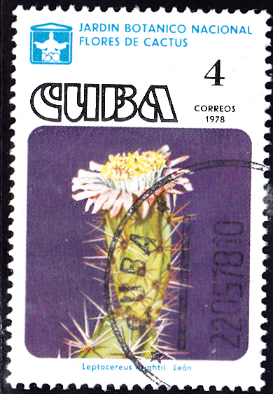Auf dieser Marker aus Kuba (MiNr 2295) wird eine Blüte des Leptocereus wrightii gezeigt.