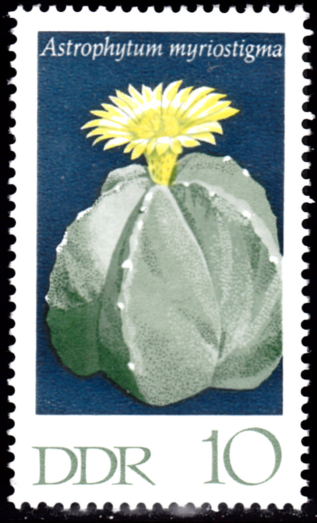 Diese Marke der DDR (MiNr1626) zeigt eine blühende Bischofsmütze (Astrophytum myriostigma).