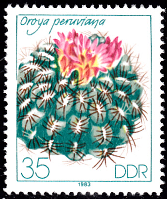 Auf dieser Marke aus der DDR (MiNr 2806) wird ein Igelkaktus der Art Oroya peruviana gezeigt.