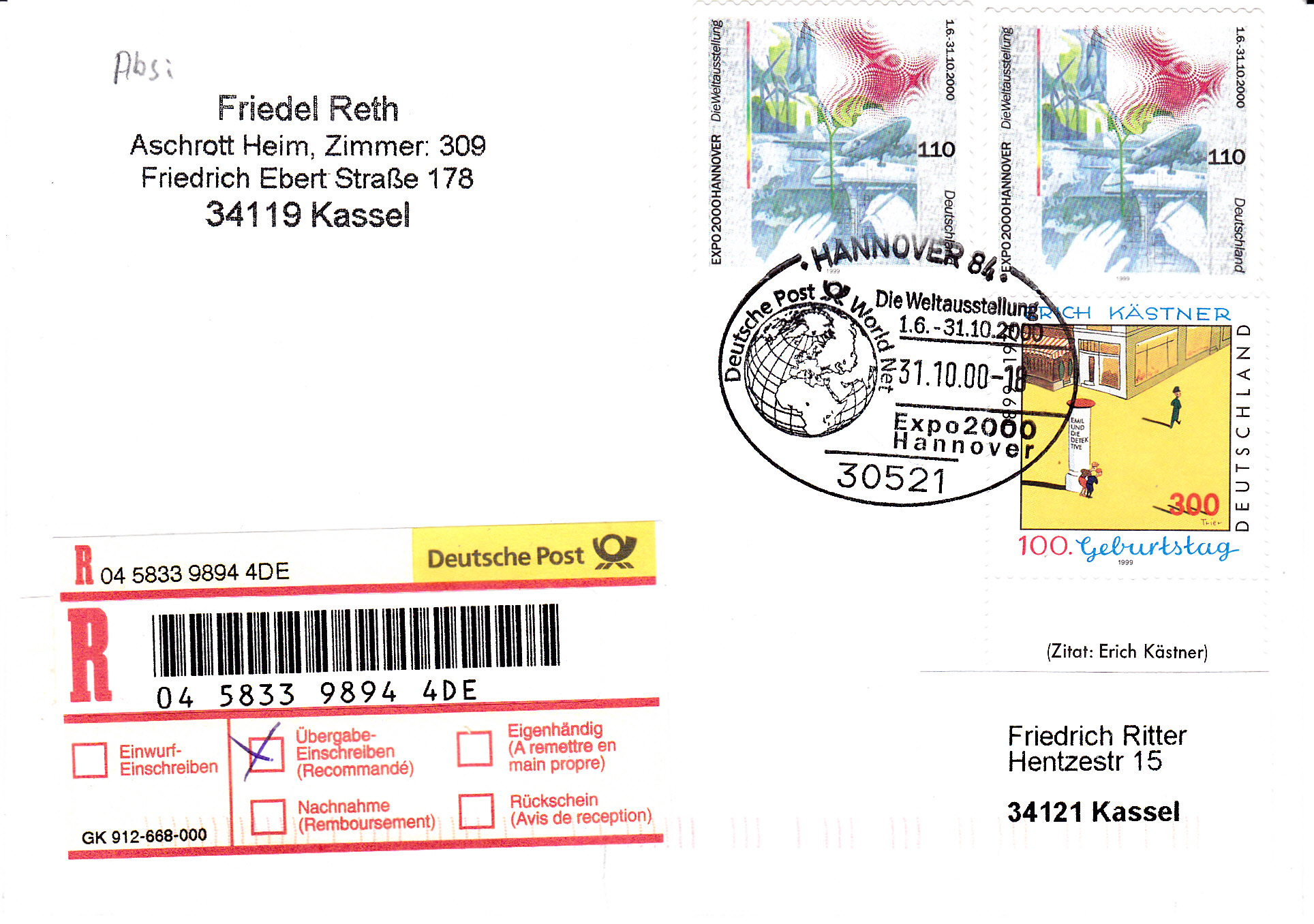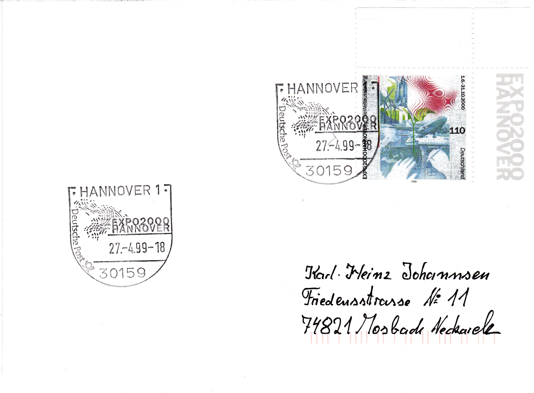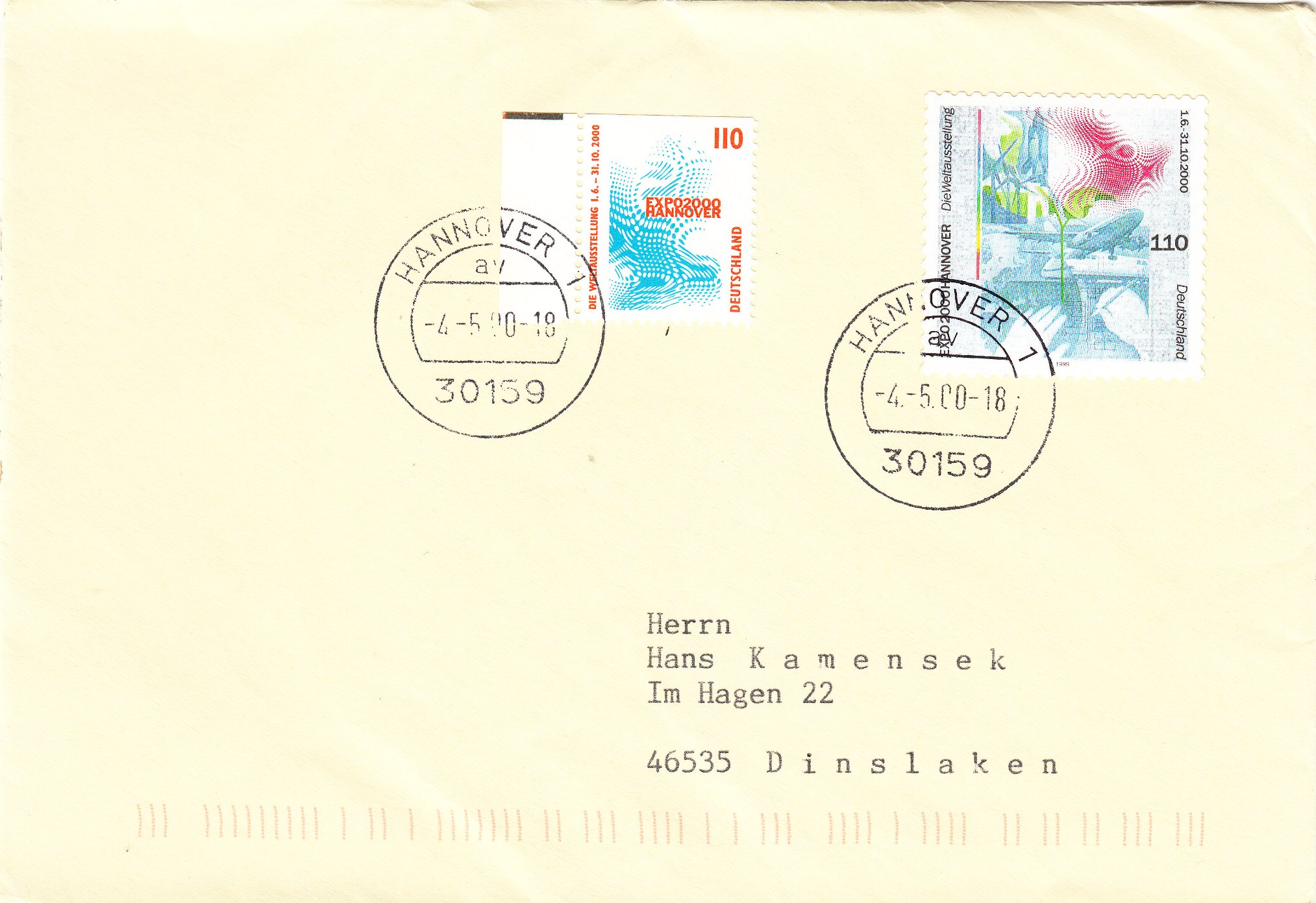 Übergabeeinschreiben mit einem anderen Sonderstempel vom 31.10.2000 zur Expo 2000. Das Porto betrug: Brief bis 20 g 110 Pf und Zusatzleistung Übergabeeinschreiben 400 Pf, also ist der Brief mit 10 Pf überfrankiert.