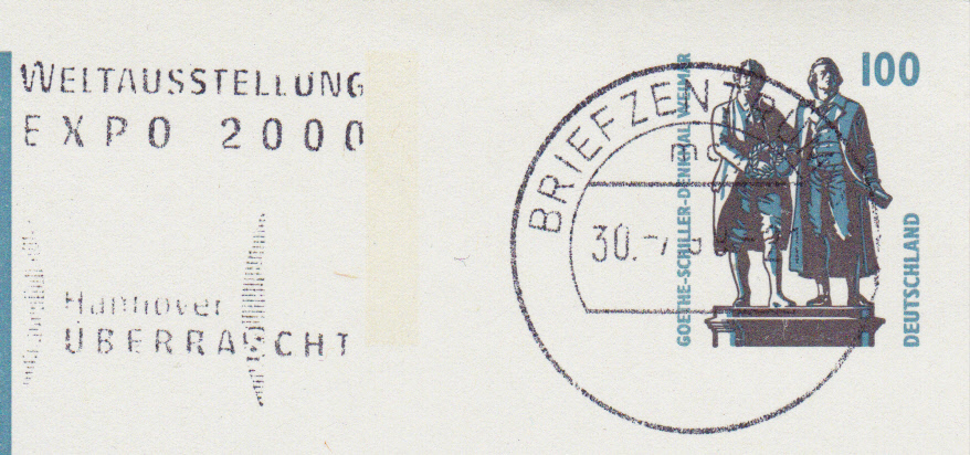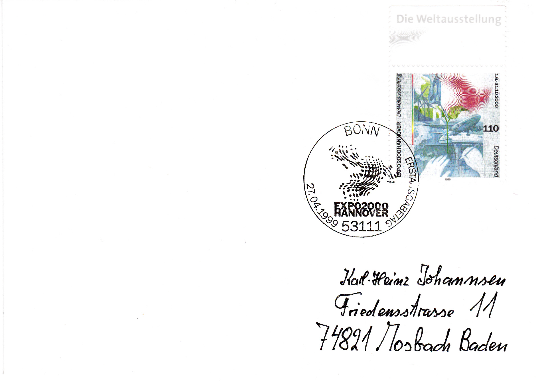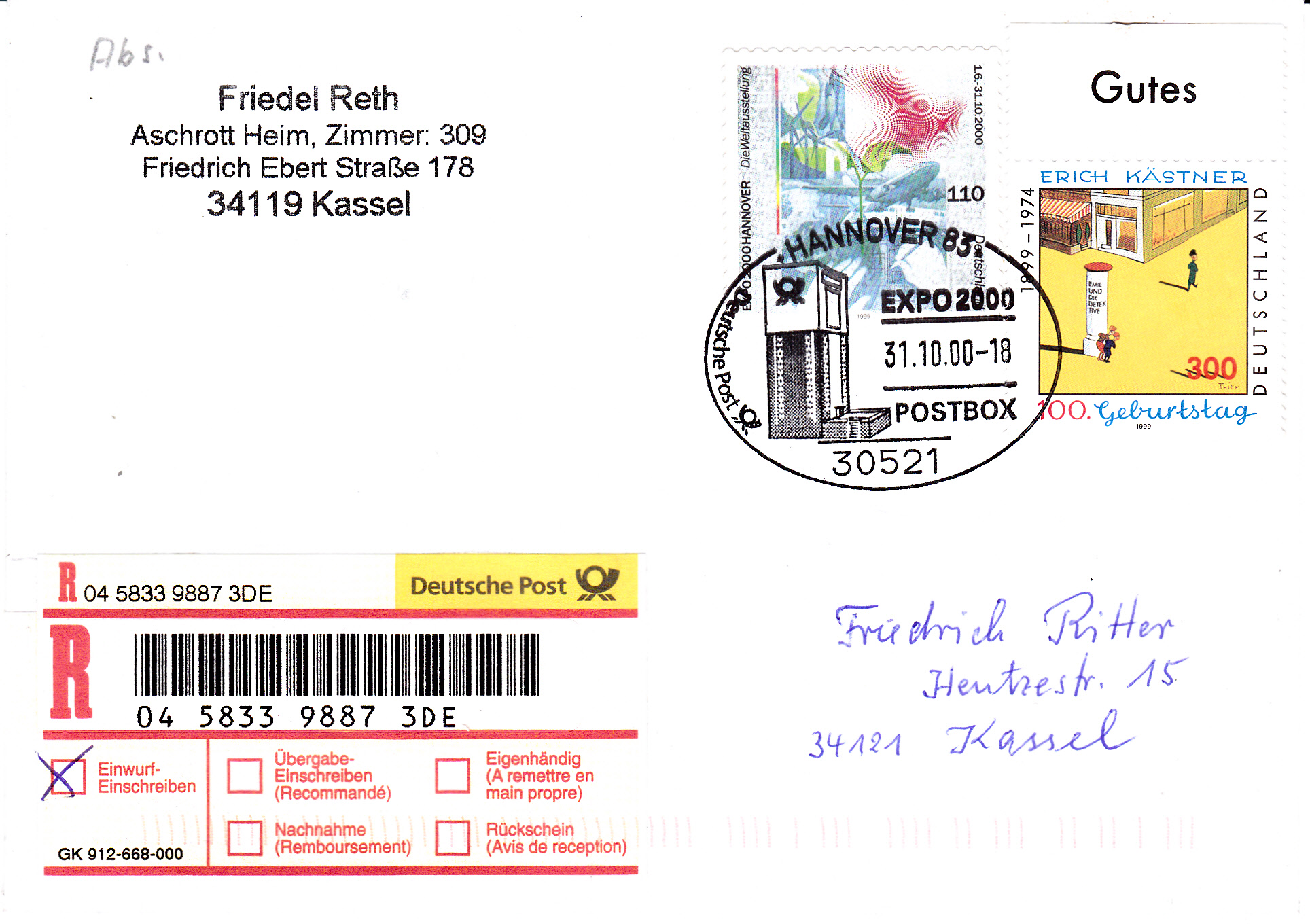 Übergabeeinschreiben mit einem anderen Sonderstempel vom 31.10.2000 zur Expo 2000. Das Porto betrug: Brief bis 20 g 110 Pf und Zusatzleistung Übergabeeinschreiben 400 Pf, also ist der Brief mit 10 Pf überfrankiert.