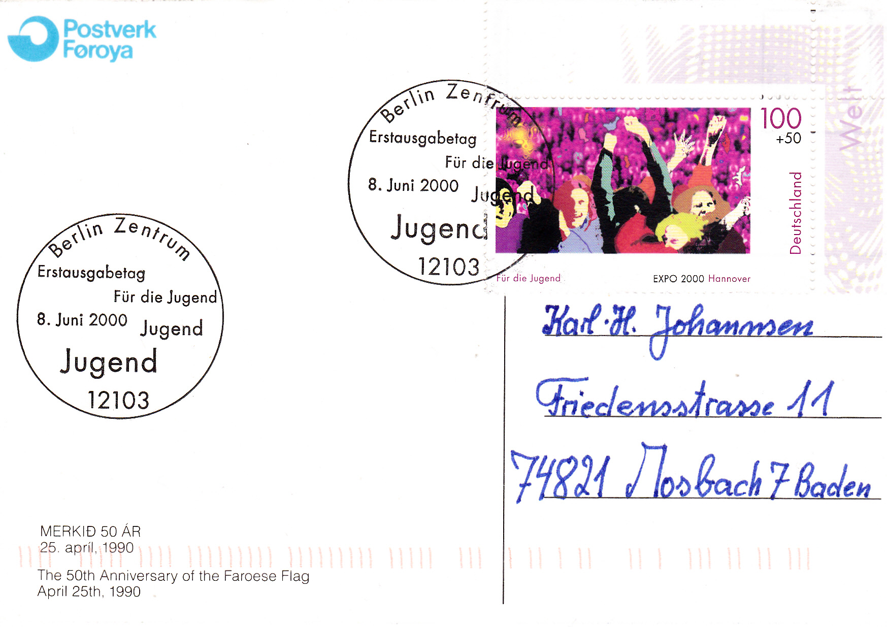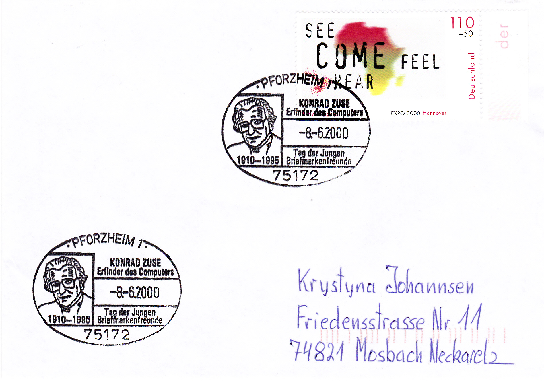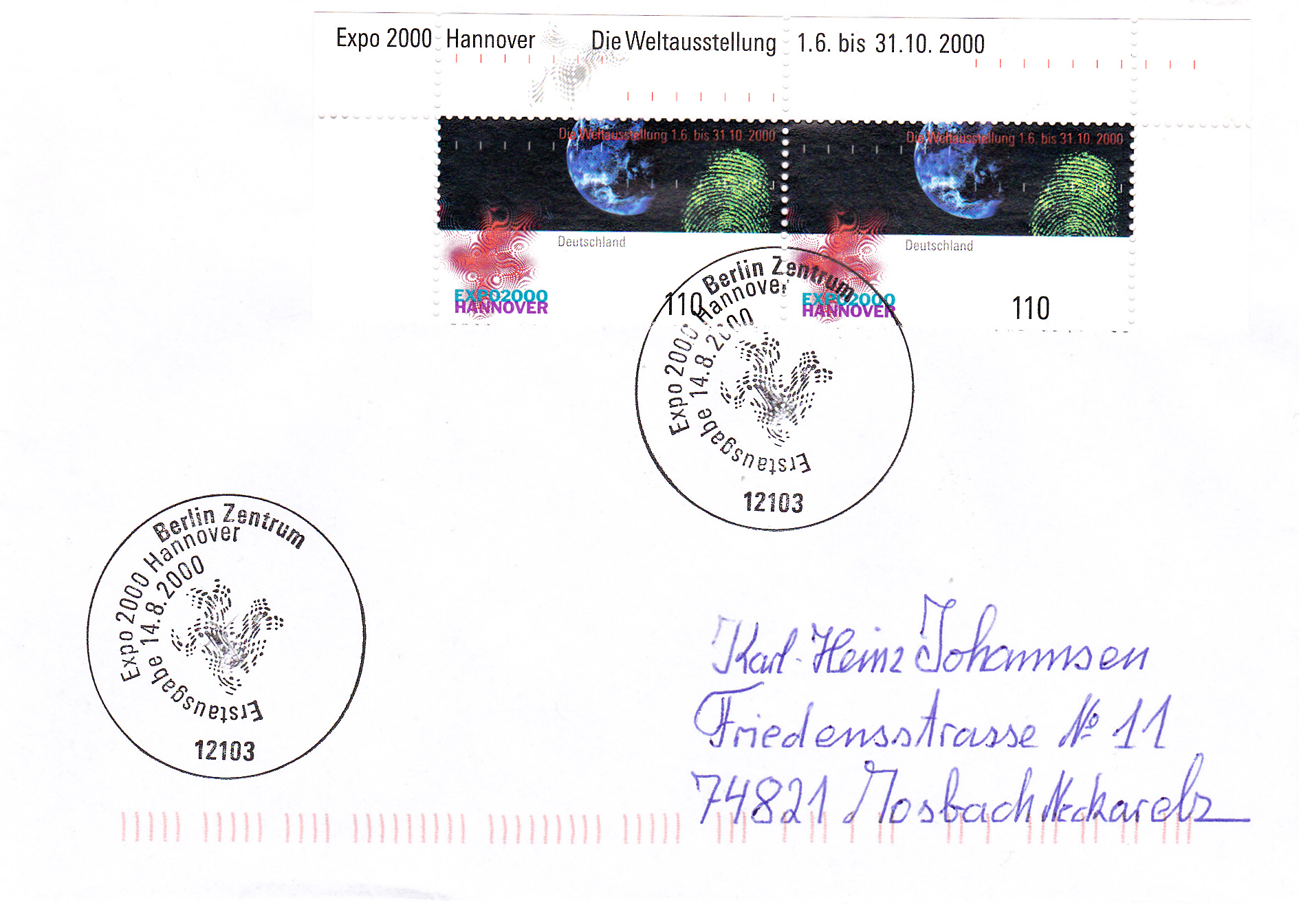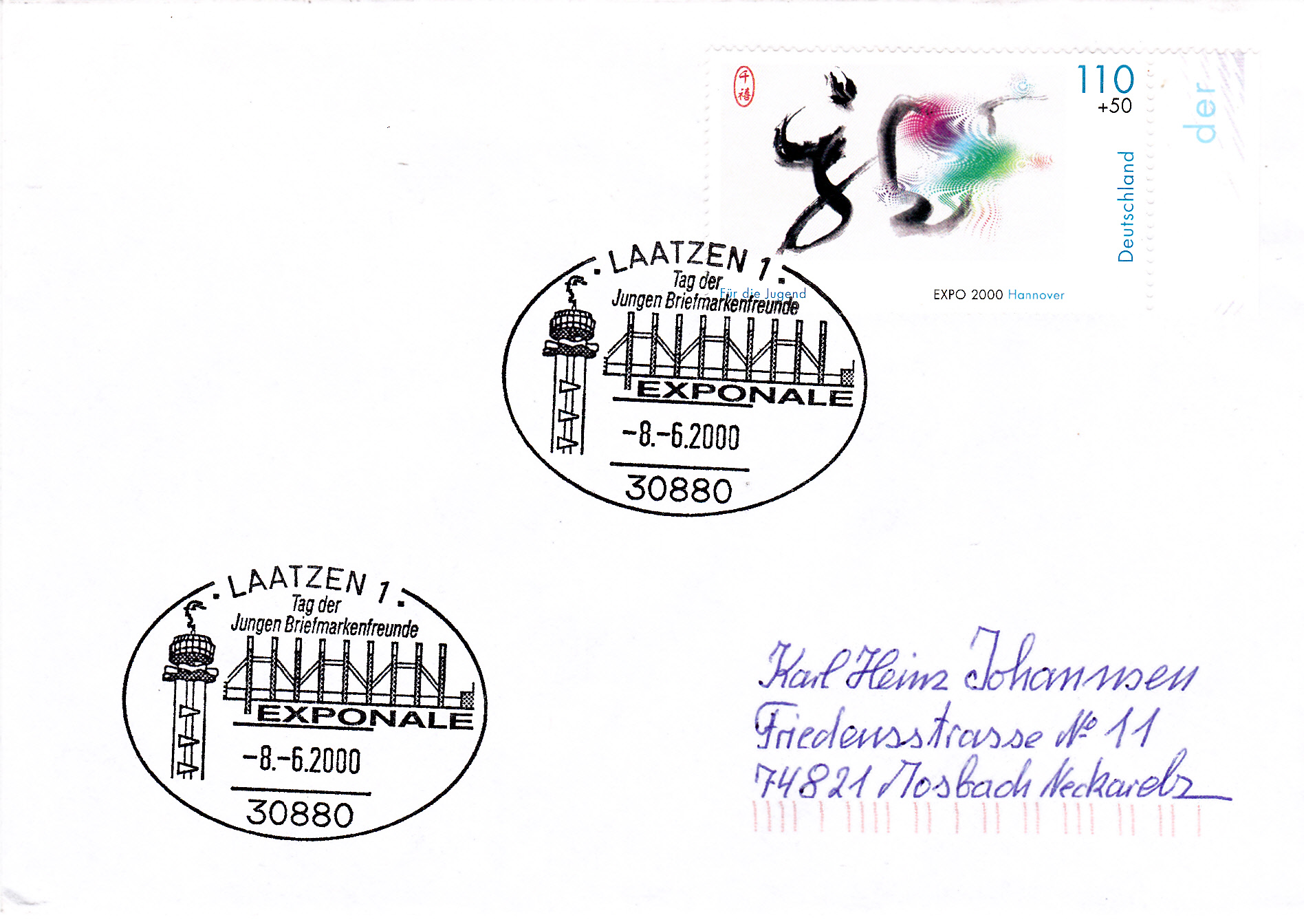 Marke zu 110+50Pf Motiv Chinesische Kalligraphie (MiNr 2121) aus der Serie "Für die Jugend" 2000, die Motive zum Thema "EXPO 2000 Treffpunkt der Jugend der Welt" zeigten, auf einem Brief mit Sonderstempel aus Laatzen vom 8.6.2000, dem Ersttag der Marke. Im Stempel wird die EXPONALE, eine Fußgängerbrücke auf dem Gelände des ehemaligen Expo-Geländes im Stadtteil Mittelfeld abgebildet.