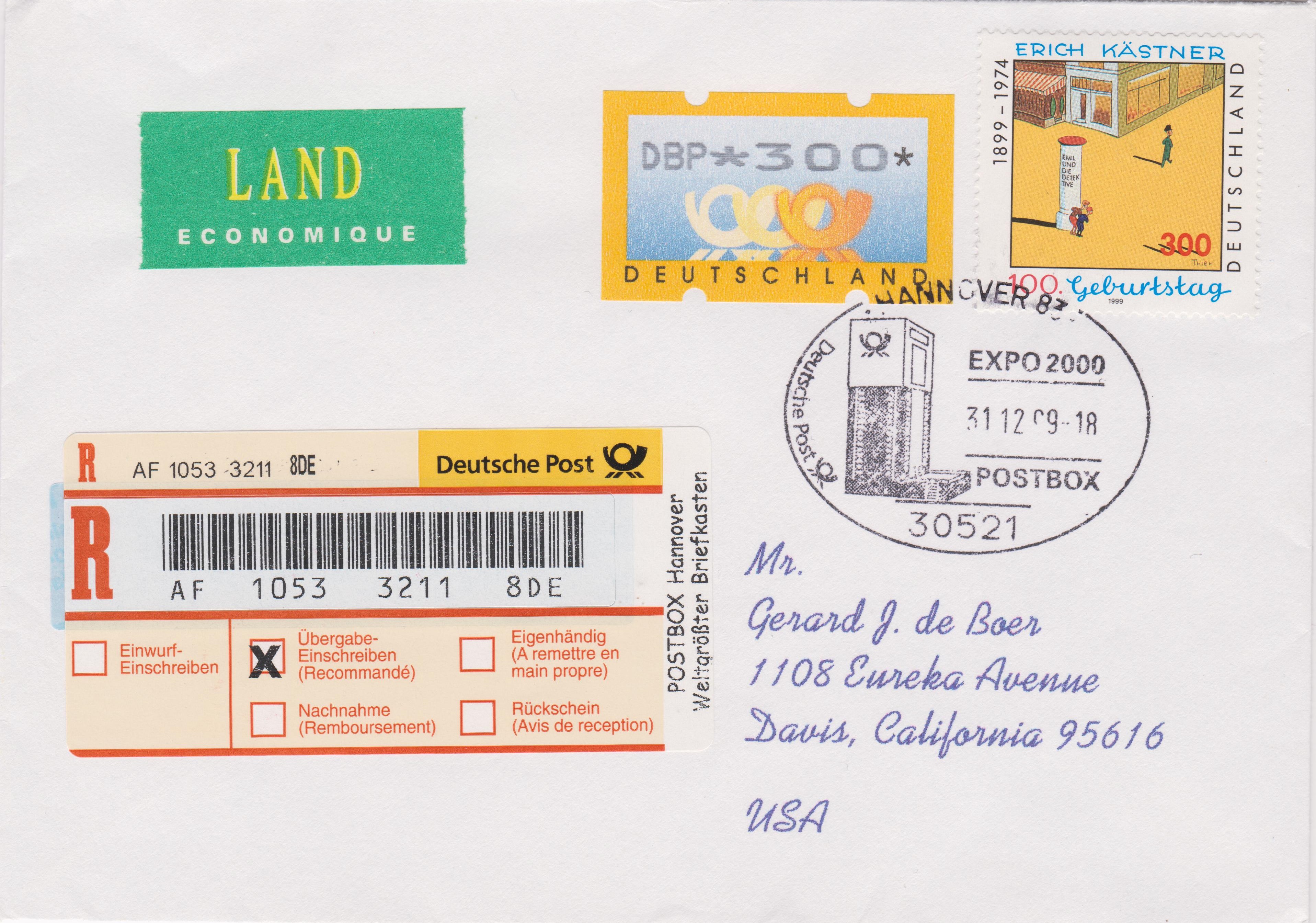 Brief per Einschreiben nach "Davis" in den USA, aufgegeben am 31.12.1999 während der "EXPO 2000" in HANNOVER 83, mit R-Zettel sowie Sonderstempel der "POSTBOX":