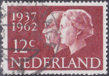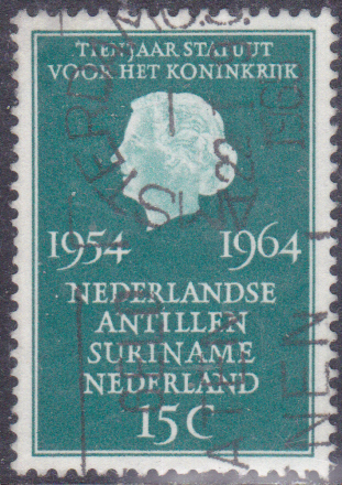 Auch die "Jubiläumsmarke "10 Jahre Statut für das Königreich der Niederlande, Surinam und die Niederländischen Antillen" (MiNr 835) zeigt Königin Juliana.