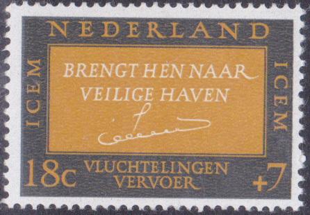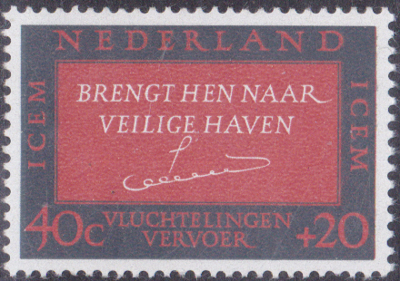Eine Markenausgabe zum Thema "Zwischenstaatliches Komitee für europäische Auswanderung (ICEM)" zeigt einen Aufruf von Königin Juliana: „Verhelft ihnen zu einem sicheren Hafen“ und Namenszug der Königin.