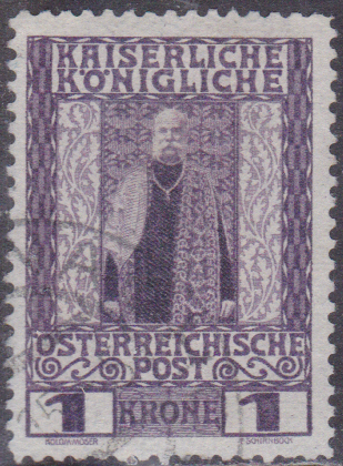Franz Joseph im Krönungsornat zeigt die Marke zu 1 Krone (MiNr 153).