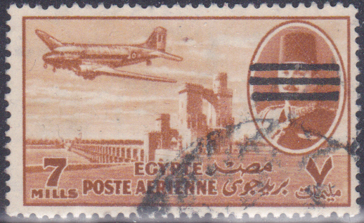 Auch die Flugpostmarken Nilstaudamm und König Faruk im Medaillon (MiNr 305–316 und 375–386) wurden mit Bdr.-Aufdruck dreier Balken über dem Porträt des Königs versehen. Hier zeige ich ein Marke zu 7 Mills (MiNr 450) als Beispiel.