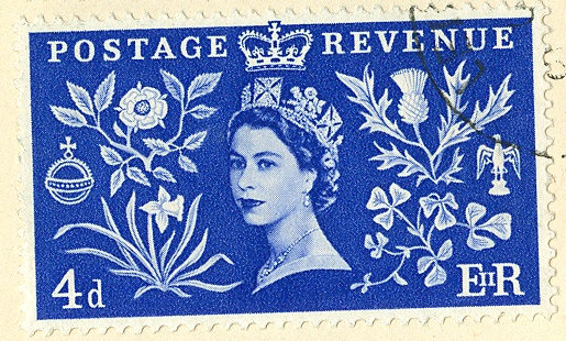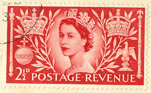 Auf dieser Marke aus dem Jahr 1953 trägt die britische Königin "Zepter" und "Reichsapfel" in der jeweils anderen Hand.