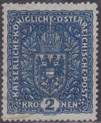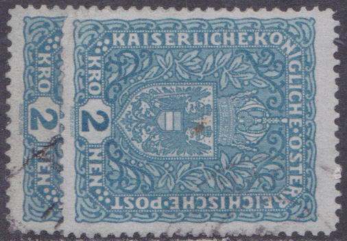 Aus einer späteren Ausgabe (1916) zeige ich eine Marke zu 2 Kronen (MiNr 200) in schwärzlichviolettultramarin. Die Kronen-Werte sind im Format etwas größer als die Heller-Werte. Ab 2 Kronen gibt es unterschiedliche Maße: I = Bildgröße 25×30 mm (schmales Format) und II = Bildgröße 26×29 mm (breites Format). Die hier gezeigte Marke ist eine MiNr 200 I.
